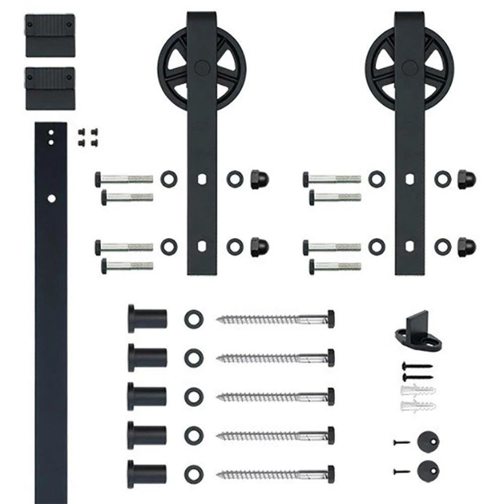 - Kit comes with all the parts needed to hang up to a standard 36 in. door, one 78 in. rail, 5 wall mounting brackets, 2 roller straps, 1 center guide, rail stops and 2 anti-jump block (door not included)
