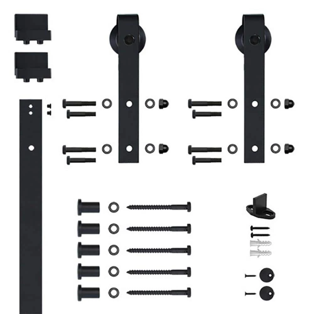 - Kit comes with all the parts needed to hang up to a standard 36 in. door, one 78 in. rail, 5 wall mounting brackets, 2 roller straps, 1 center guide, rail stops and 2 anti-jump block (door not included)