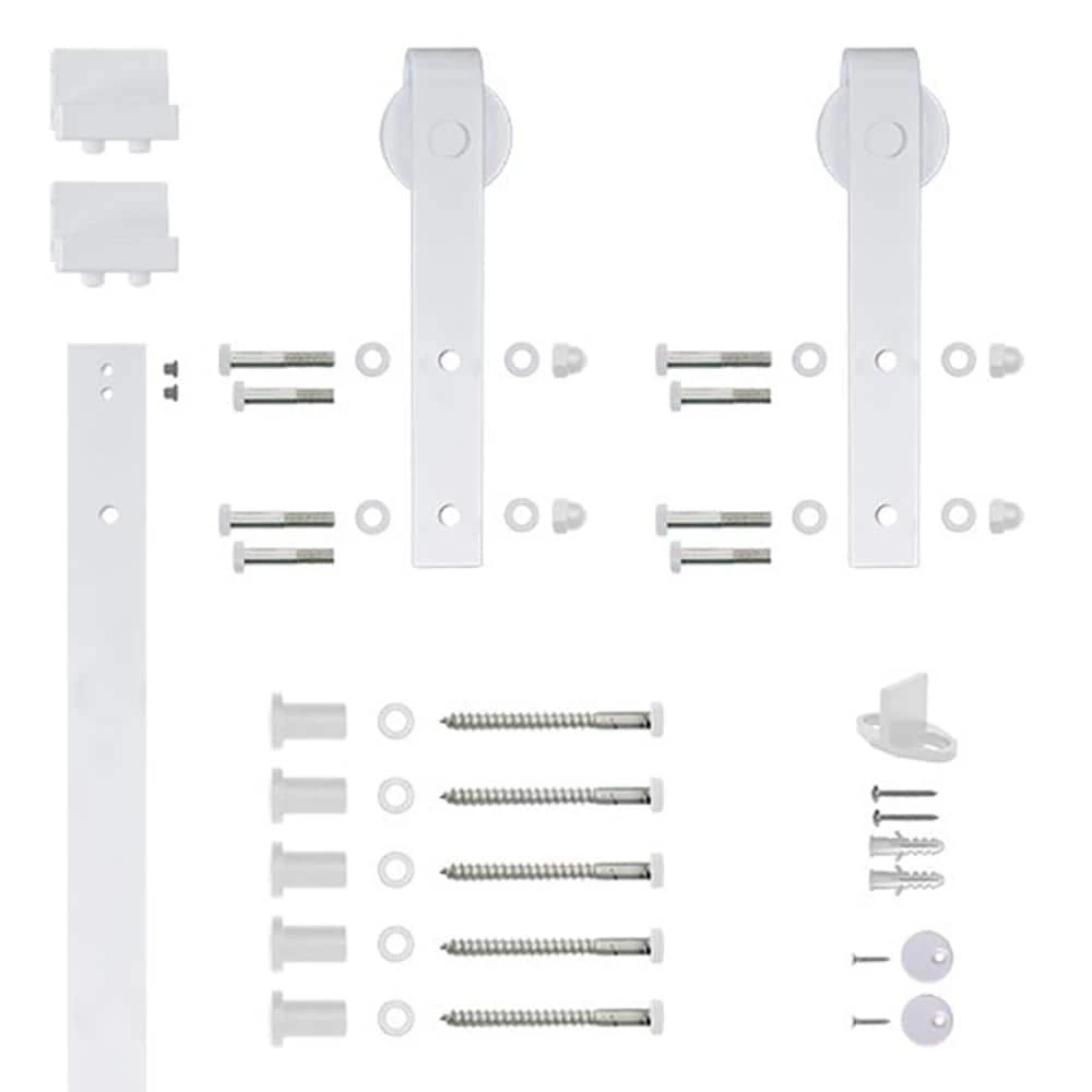 - Kit comes with all the parts needed to hang up to a standard 36 in. door, one 78 in. rail, 5 wall mounting brackets, 2 roller straps, 1 center guide, rail stops and 2 anti-jump block (door not included)