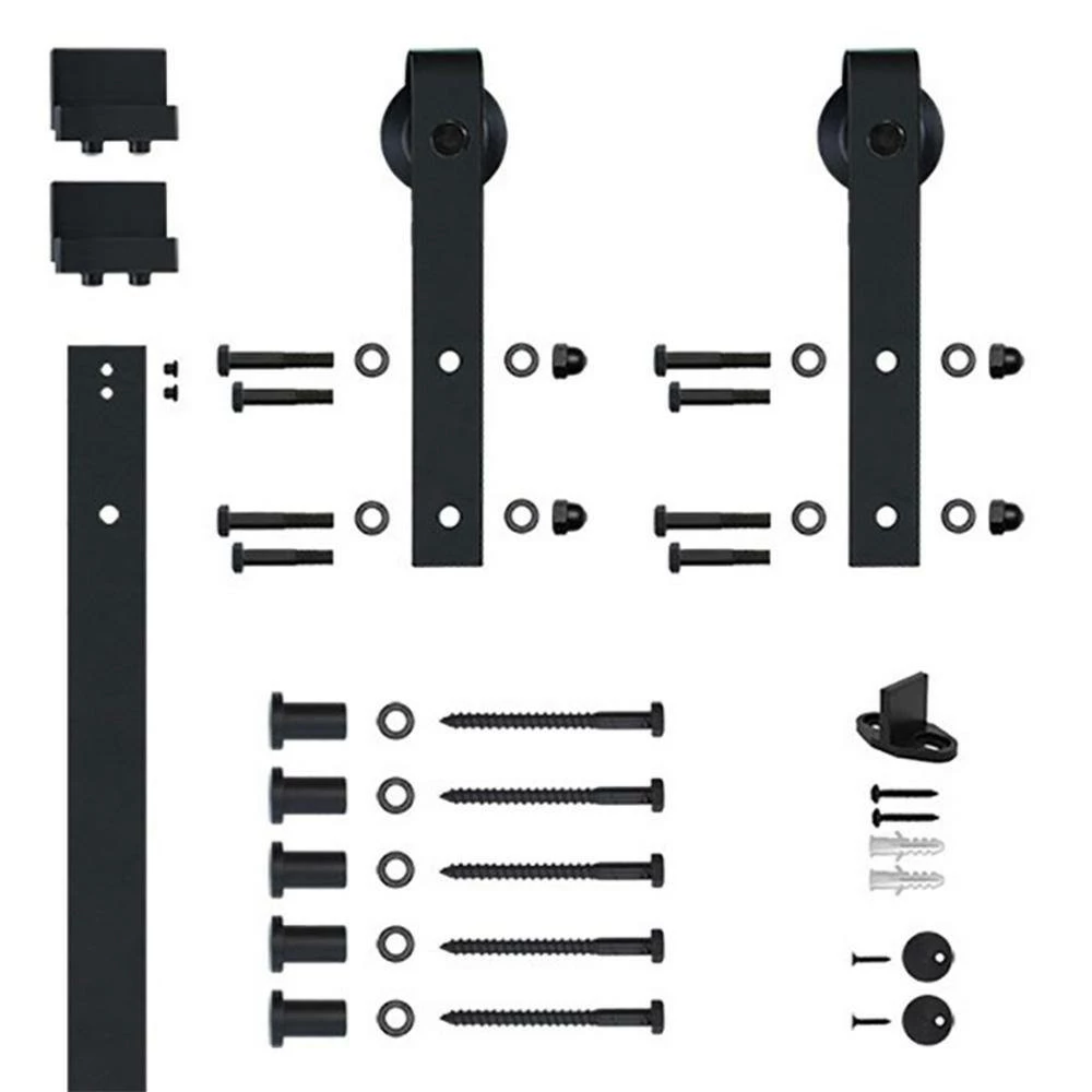 - Kit comes with all the parts needed to hang up to a standard 48 in. door, one 96 in. rail, 6 wall mounting brackets, 2 roller straps, 1 NylonFloor center guide, rail stops and 2 anti-jump block (door not included)